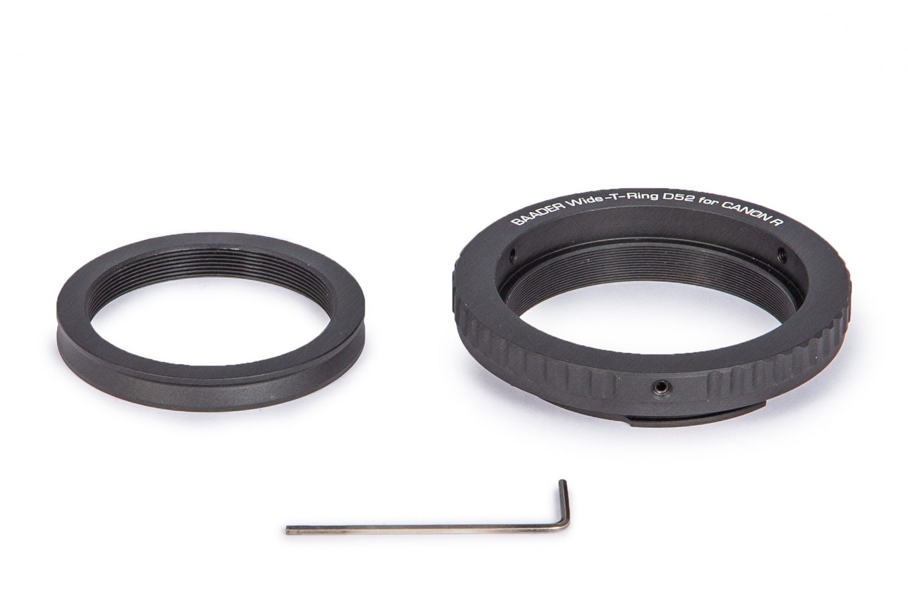 The Baader Wide-T-Ring Canon R connects Canon EOS R cameras on the Astro T-2 system and S52 dovetail. This adapter comprises two parts: a camera-specific bayonet mount ring and an inner adapter ring with standard T-2 female threads. Removing the inner T-2 adapter presents a larger clear aperture than a normal T-ring, which is good for full-frame cameras, and the illumination of the camera chips improved significantly, mainly because of the larger clear aperture. The T-ring can be modified to an M48 female thread using the S52 / M48 adapter #2958552, or with the S52 / M68 adapter # 2458252, the Wide-T-Ring can be directly attached to an M68 male thread to securely fasten your camera to the widest possible aperture.