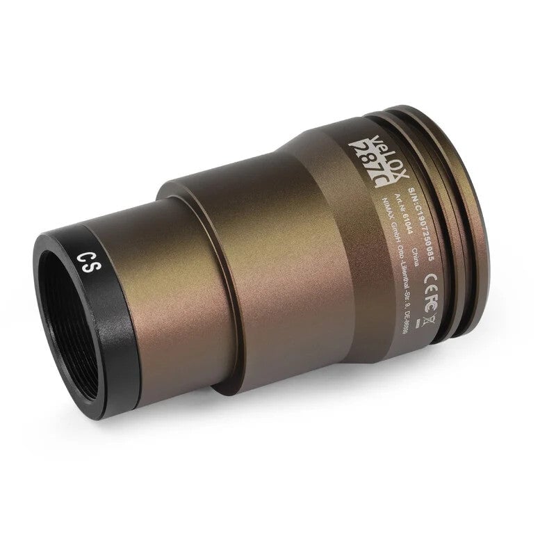 The Omegon veLOX 287 Color is a high-speed CMOS camera ideally suited for planetary, lunar, and solar astrophotography as well as precision autoguiding. Featuring exceptionally large 6.9µm pixels for superior sensitivity, this camera captures at up to 520 fps at full resolution and is equipped with an infrared-blocking filter for accurate color reproduction. Its compact aluminum body fits 1.25" filter threads and integrates seamlessly with popular astrophotography software including PHD2, ASCOM, and INDI, making it an excellent choice for both deep-sky and high-framerate lucky imaging applications.