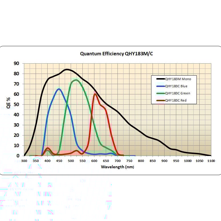 The QHY183M is a one-inch, 20 megapixel back-illuminated monochrome CMOS camera with a peak quantum efficiency of 84% and pixel size of 2.4um, yielding high-resolution imaging with modest size telescopes. The camera features two-stage TEC cooling that cools the sensor as low as 45°C below ambient, ideal for warm and damp summer observing conditions. With readout noise as low as 1 electron and a full well depth of 15.5ke⁻, this camera excels for 4K video output at 31fps and full resolution real time output at 19 frames per second, making it ideal for serious deep-sky imagers.