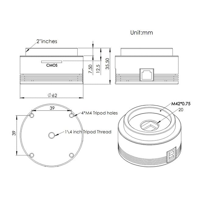 | Mount Thread Options | 1/4-20 inch (bottom) and four M4 threads (edges) |