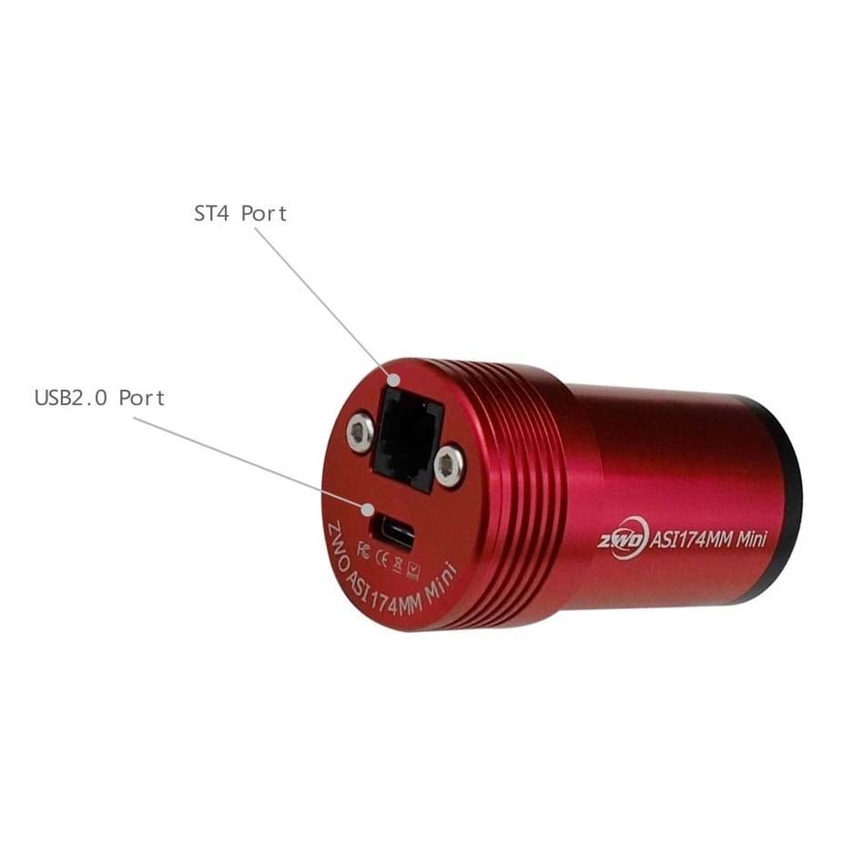 The ZWO ASI174MM-Mini is a compact monochrome astronomy camera intended for autoguiding during long exposure astrophotography or for planetary imaging. Its 1/1.2" image sensor and 1936x1216 resolution generate images of outstanding sharpness and speed, making it a stellar companion for solar observation, lunar mapping, and planetary surveying. The large 11.3mm x 7.1mm sensor gives you a significantly wider field of view than most traditional guide cameras, making it much easier to locate guide stars, especially when using an off-axis guider on longer focal length telescopes. The ASI174MM-Mini weighs just 4.9oz, making it an ideal lightweight solution for both guide camera applications and high-resolution planetary or solar imaging.