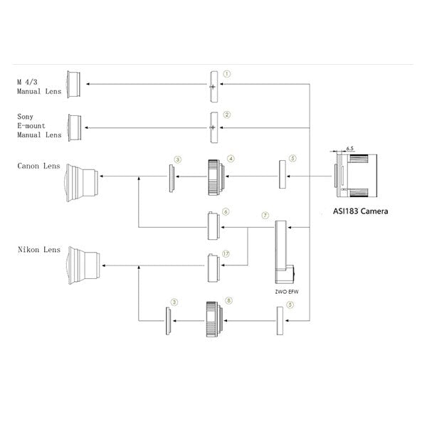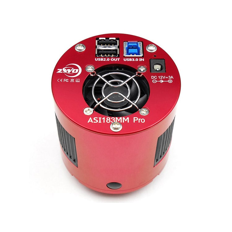 The ZWO ASI183MM Pro is a versatile and highly sensitive cooled monochrome astronomy camera featuring a 20.1-megapixel Sony IMX183 back-illuminated CMOS sensor with 5496x3672 resolution and 2.4-micron pixel size, ideal for capturing high-resolution images of deep-sky objects such as nebulae, supernova remnants, and galaxies, as well as lunar and solar imaging and electronically-assisted astronomy. With integrated TEC cooling that reduces sensor temperature 40-45°C below ambient, the camera achieves fast USB3.0 transfer at up to 19 fps at full resolution, backed by a 256MB DDR3 buffer for stable data transfer and reduced amp glow. Its high peak quantum efficiency of 84%, low readout noise of 1.6e, and back-illuminated sensor design make it an incredibly sensitive camera with exceptional signal-to-noise ratio.
