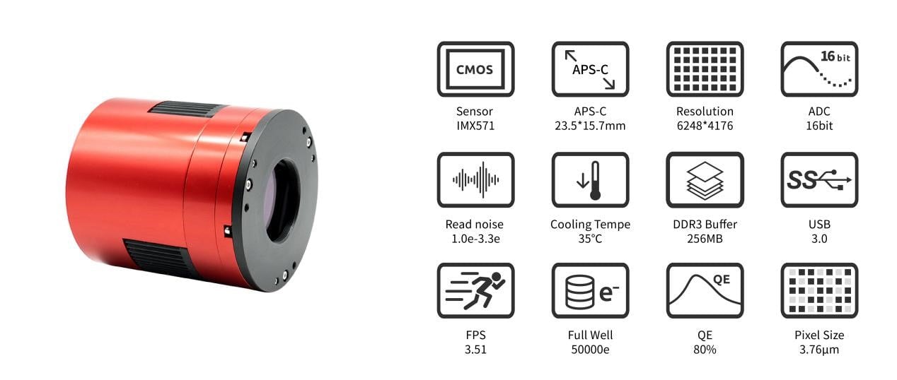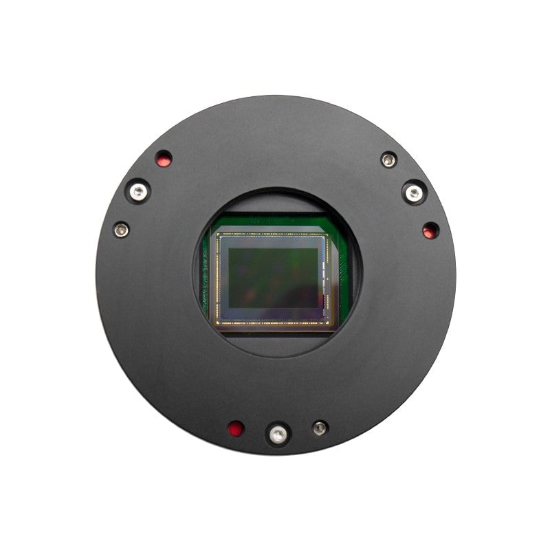 The ZWO ASI2600MC Pro is a dedicated, cooled, one-shot color astronomy camera featuring a 26-megapixel Sony IMX571 back-illuminated APS-C CMOS sensor. With exceptional quantum efficiency of 91%, the camera records nearly all photons hitting its sensor as data, enabling fast capture of faint targets with superior detail. The innovative two-stage TEC cooling system produces such low noise that many astrophotographers skip taking dark frames for post-processing. Combined with high-speed USB 3.0 data transfer and a 512MB DDR3 cache, the camera eliminates amp glow and frame dropping during extended exposures.