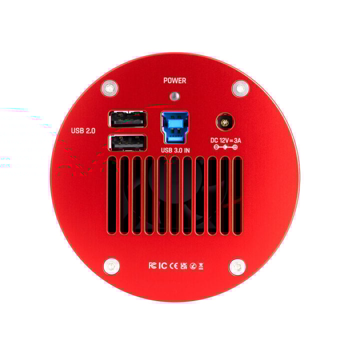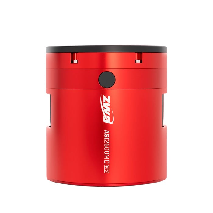 The ZWO ASI2600MC Pro is a dedicated, cooled, one-shot color astronomy camera with an extremely sensitive Sony IMX571 back-illuminated CMOS sensor in APS-C format, offering 26-megapixels for extremely detailed astrophotography. With a quantum efficiency of 91%, the camera records nearly all photons hitting its sensor, collecting more light more efficiently to capture faint targets like galaxies and planetary nebulae faster and with better detail. The innovative two-stage TEC cooling system improves the low-noise design of its CMOS sensor, resulting in images with so little dark-current noise that many astrophotographers skip taking dark frames for post-processing. The camera features a high-speed USB 3.0 interface, onboard DDR3 cache, zero amp glow technology, and an anti-dew heater, making it an excellent choice for deep-sky astrophotography.