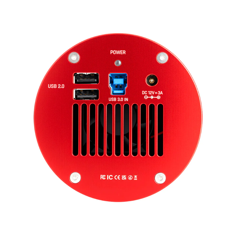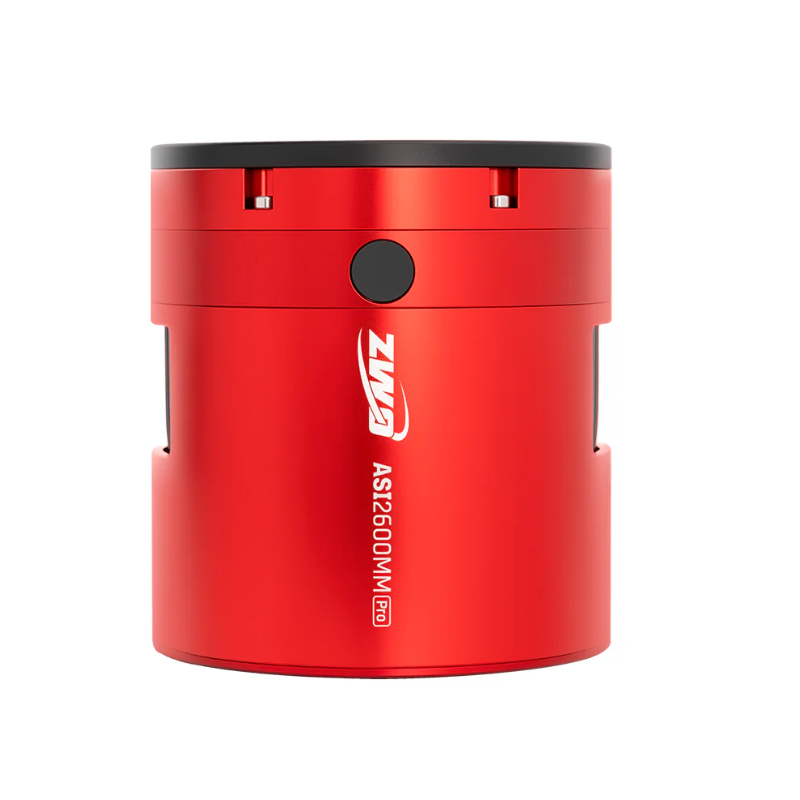 The ZWO ASI2600MM Pro is a premium cooled monochrome astrophotography camera featuring a 26-megapixel APS-C Sony IMX571 sensor with 91% peak quantum efficiency, making it ideal for deep-sky imaging with narrowband or LRGB filters. Its dual-stage TEC cooling system reduces sensor temperature by up to 35°C below ambient conditions, combined with zero amp-glow circuitry and a 512MB DDR3 buffer, to deliver exceptionally clean data even during long exposures. With 14 stops of dynamic range from its native 16-bit ADC and an advanced dual-gain architecture, the camera excels at capturing faint nebulae and galaxies with superior signal-to-noise performance, while maintaining a lightweight 0.7 kg design that works seamlessly with diverse telescope configurations.