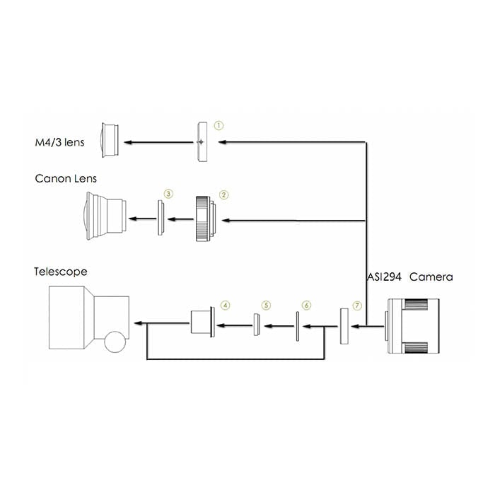 The ZWO ASI294MC is a versatile uncooled color astronomy camera equipped with Sony's IMX294CJK Micro-4/3 format sensor, ideal for both deep-sky and high-resolution planetary imaging. With 11.7 megapixels, large 4.63-micron pixels, and a full well capacity of 63,700 electrons, this camera delivers exceptional signal-to-noise ratio and low-illumination performance for astrophotography applications. The USB 3.0 interface enables fast data transmission at up to 19 fps in 10-bit mode or 16 fps in 14-bit mode at full resolution, making it equally capable for extended deep-sky exposures or rapid planetary capture.