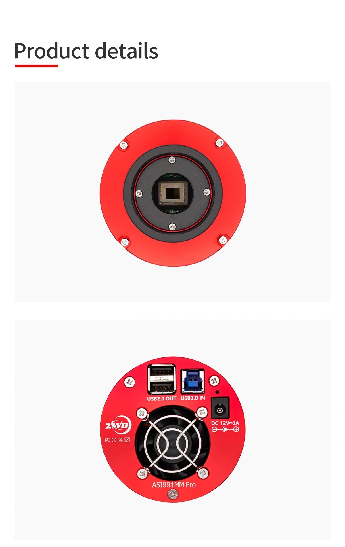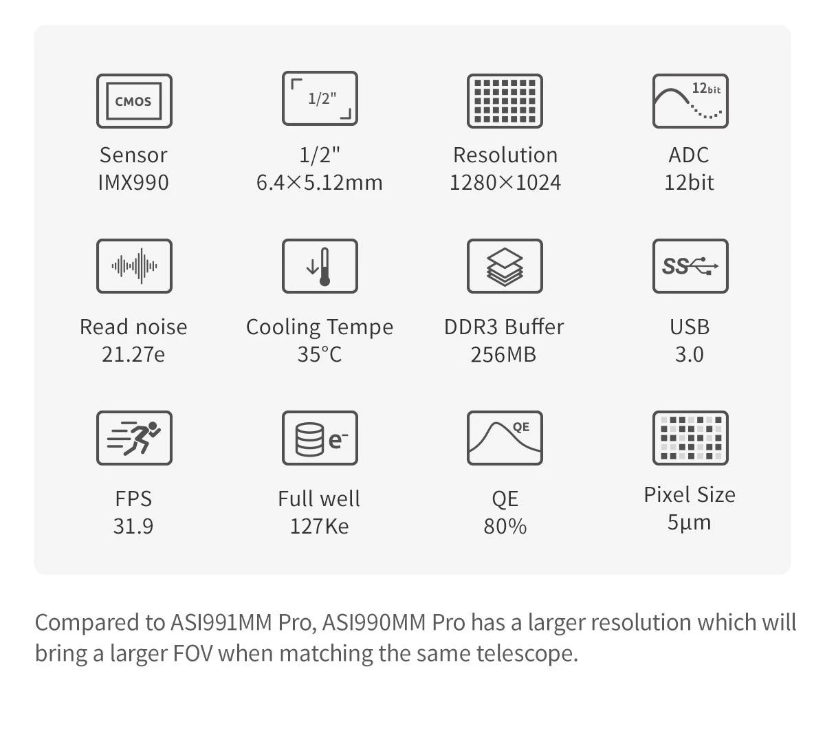 The ZWO ASI990MM Pro is a scientific-grade, cooled shortwave infrared (SWIR) monochrome camera built on Sony's IMX990 InGaAs sensor, designed for advanced deep-sky imaging and specialized astrophotography. With 1.3MP resolution, 5-micron pixels, and sensitivity spanning 0.4-1.7 micrometers, it enables imaging through light pollution, thin clouds, and even daytime conditions by capturing wavelengths invisible to conventional cameras. Featuring dual-stage TEC cooling that reduces sensor temperature up to 35°C below ambient, ultra-low read noise (~21 electrons), 80% peak quantum efficiency at 1200nm, and zero amp-glow circuitry, the camera delivers exceptionally clean data for long-exposure scientific imaging, photometric measurements, optical communication, and specialized research applications.
