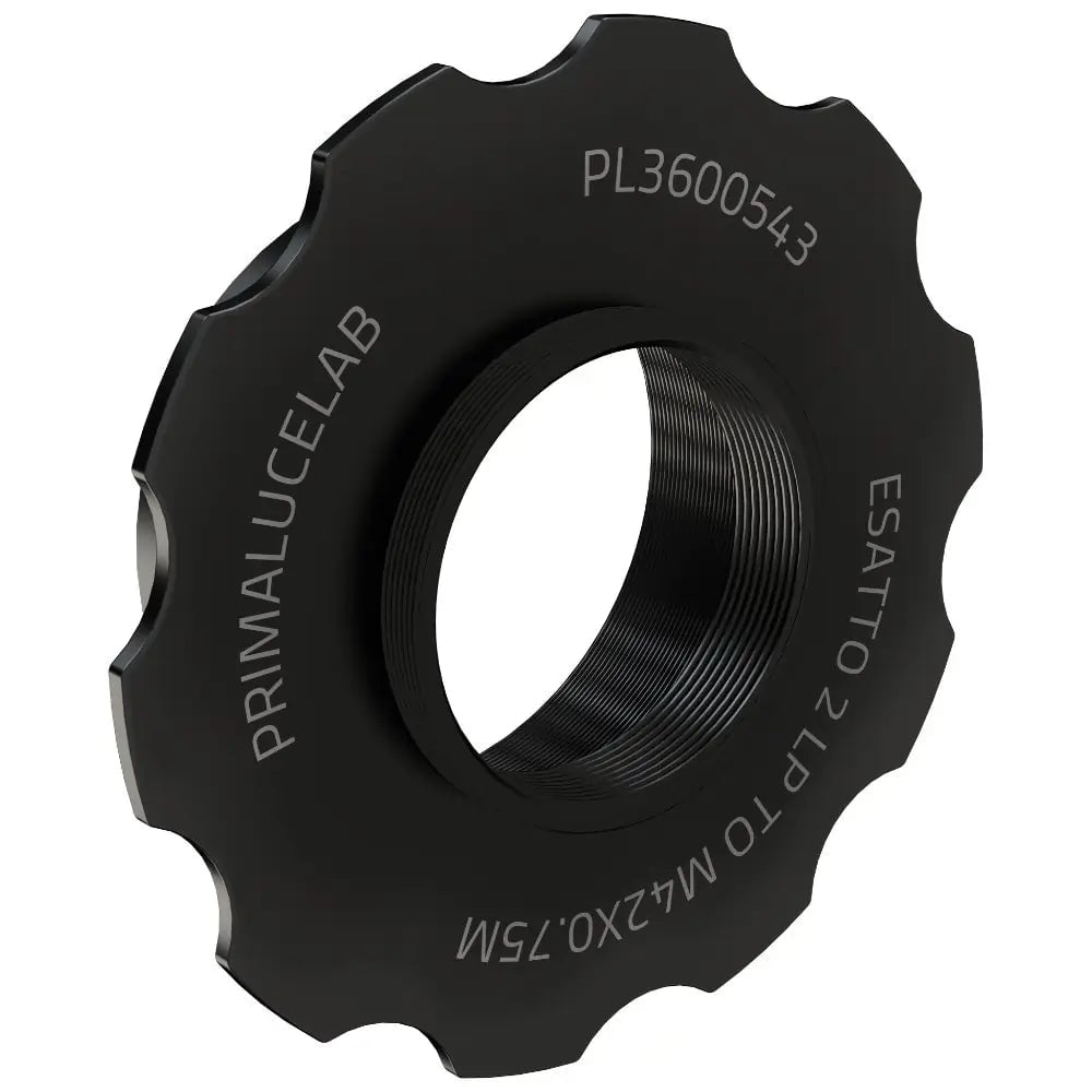 This precision thread adapter allows astrophotographers to connect M48-threaded cameras and accessories to the M60 draw tube of PrimaLuceLab's ESATTO 2" LP low-profile robotic focuser. The integrated stop ring enables precise camera angle adjustment for optimal sensor framing and composition during deep-sky imaging sessions. The adapter maintains a minimal optical thickness of 2.5mm when the stop ring is attached, or zero optical thickness when removed, making it ideal for telescopes with tight backfocus constraints.