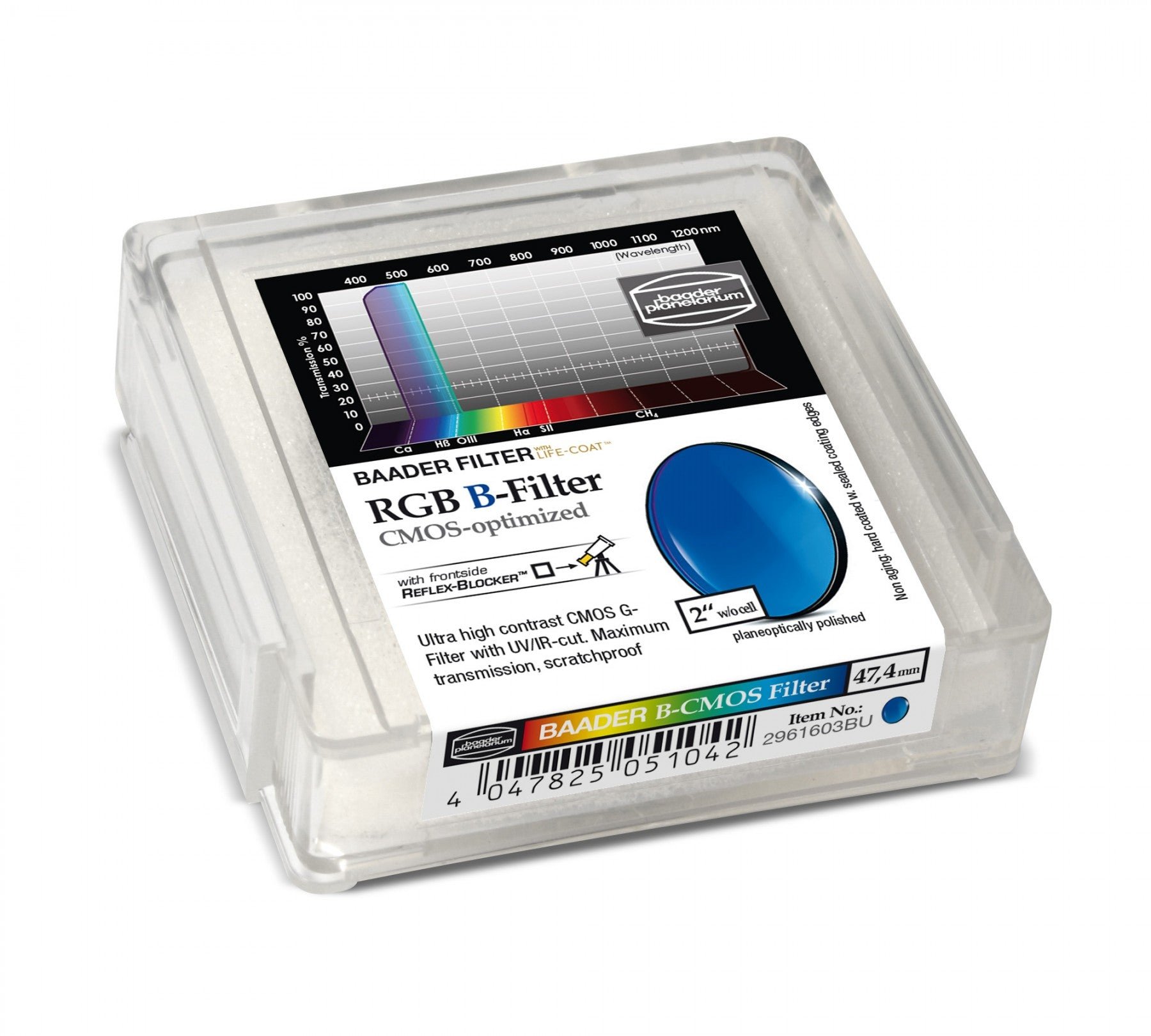 The Baader CMOS Optimized RGB-B Filter is an anti-reflection blue bandpass filter with extremely high transmission of the blue color channel, optimized for modern CMOS cameras while also performing excellently with CCD camera technologies. With a balanced RGB design, it allows subframes to be taken with the same exposure time—critical for automated imaging tasks—with the FWHM carefully designed for 1:1:1 exposures matched to typical CMOS quantum efficiency and signal-to-noise ratio. This 47.4mm unmounted blue filter is especially selected for use with 2" filter sliders of the Baader FCCT (Filter Changer Camera Tilter) for RASA 8 and QHY cameras. The Baader Life-Coat™ technology provides durable coatings that resist moisture, temperature extremes, and are hardened to withstand normal cleanings.
