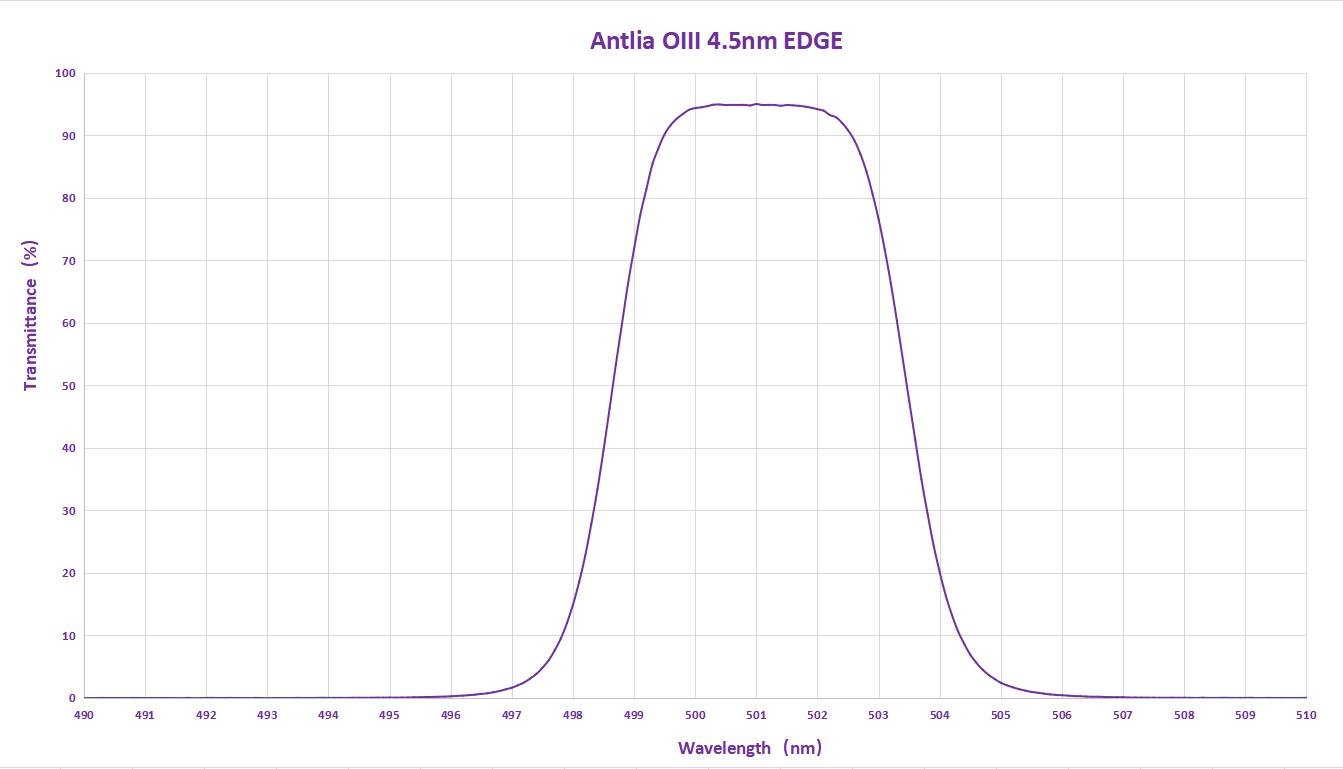 The Antlia OIII 4.5nm EDGE filter is designed to deliver 85% transmission at the 500.7nm oxygen-III emission line, providing maximum signal to reveal the faintest OIII nebulae structures. This narrowband filter optimizes the FWHM (full width half maximum) to 4.5nm bandpass, with OD5 suppression of unwanted wavelengths and incorporates the excellent transmittance characteristics of the Antlia 3nm Pro series. These filters deliver superior signal-to-noise ratio (SNR) and better contrast in astrophotography images. The 4.5nm EDGE design ensures high transmittance for working with both long focal ratios and fast optical systems, from f/4 down to f/3 or faster.