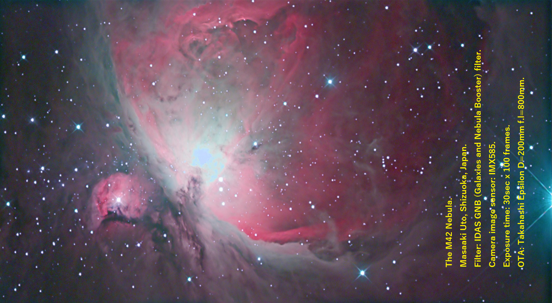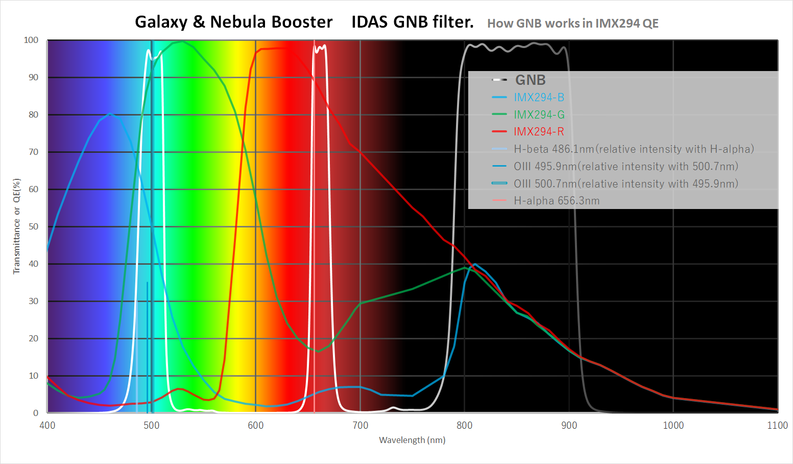 The IDAS GNB is a world's first galaxy and nebula booster filter intended for shooting not only nebulae, but also galaxies by the use of transmittance around the near infrared region. The filter passes through the Ha and OIII regions in the same manner as the IDAS NBZ to suppress light pollution in visible light regions, while uniquely passing through the near infrared region intended for shooting galaxies that cannot be shot with conventional nebula filters. The near-infrared transmission band spans approximately 100 nanometers, ranging from 800 to 900 nanometers, making it ideal for both emission nebula and galaxy imaging from light-polluted skies when paired with infrared-sensitive camera sensors.