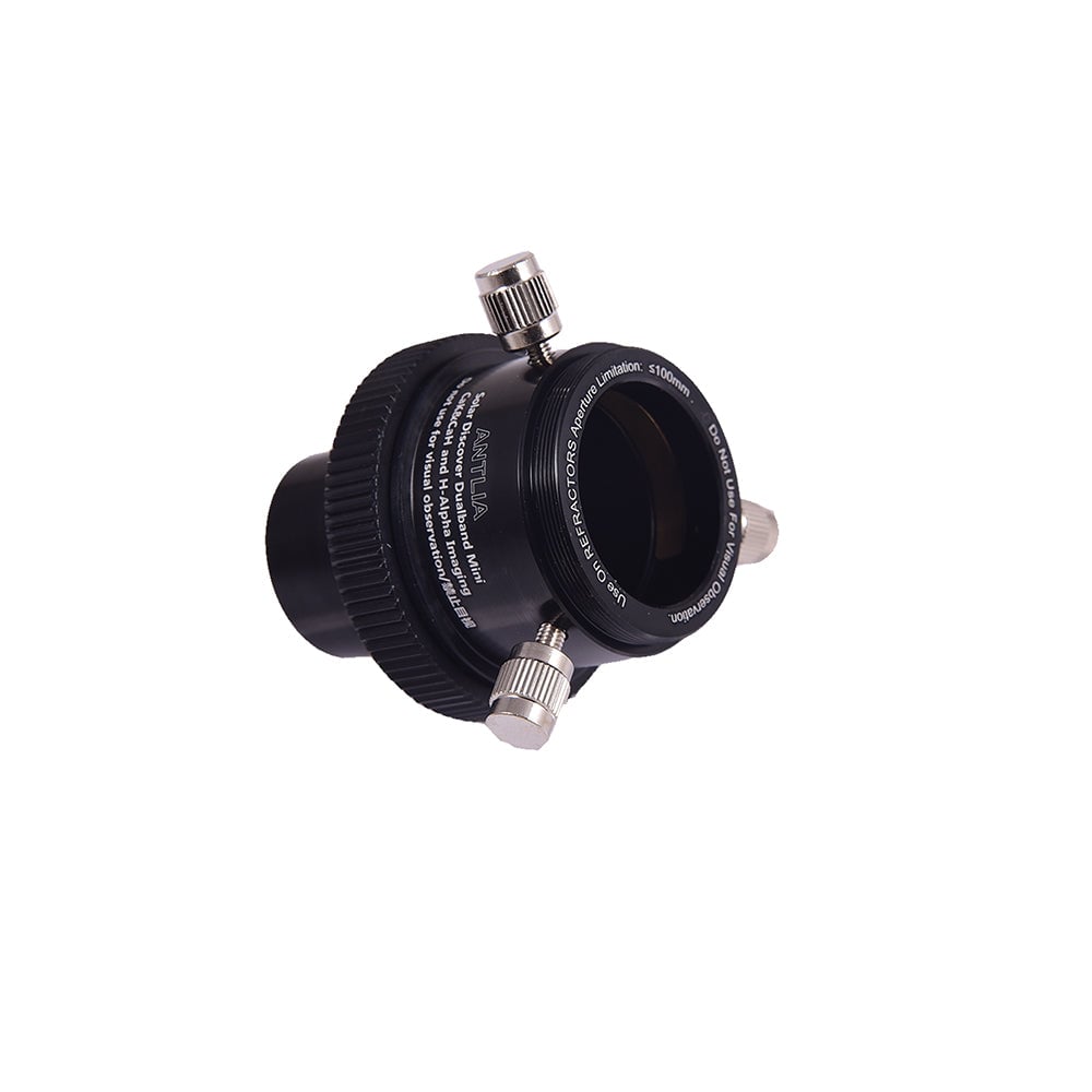 The Antlia Solar Discover Dualband (Ha, CaK, and CaH) filter assembly is specifically designed for solar photosphere photography, effectively enhancing contrast and sharpness in solar imaging with greater visibility of surface details and highlights of sunspots, while also providing higher contrast for solar faculae. The complete assembly comes with an Antlia Energy Rejection Filter (ERF) that blocks UV and IR light to allow the desired wavelengths Ha 656.3nm, CaK 393.3nm, and CaH 396.8nm to pass through, with a necessary ND filter already manufactured installed in the tube. The mini version is designed with 1.25" adapter for direct connection to standard 1.25" focusers, making it ideal for refractor telescopes up to 100mm aperture without requiring additional aperture reduction.