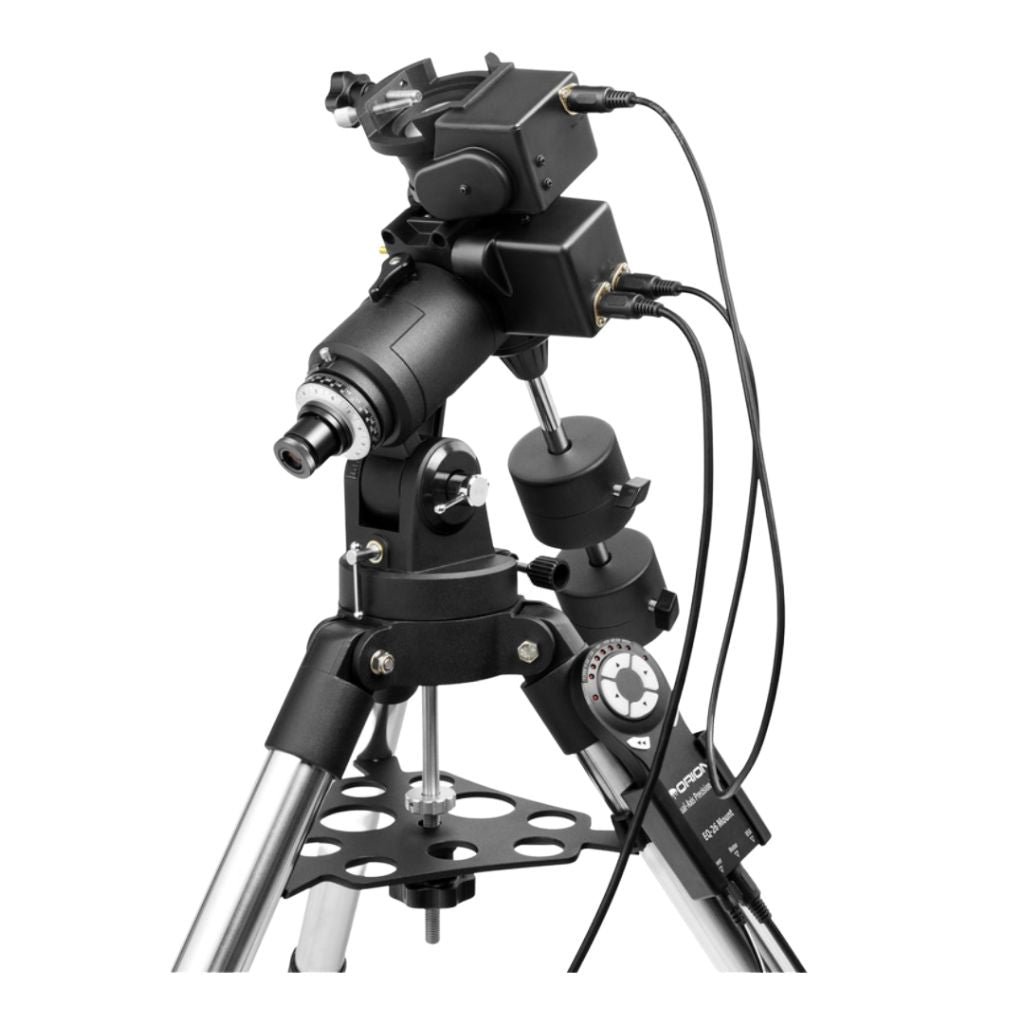 The Orion EQ-26 Motorized Equatorial Mount and Tripod is a fully motorized German equatorial mount supporting up to 26 lbs. of telescope payload with integrated dual stepper motors allowing sidereal-rate tracking and quiet slewing up to 800x sidereal speed. A built-in polar scope with reticles for both Northern and Southern hemisphere alignment makes precision polar alignment straightforward. The Vixen-style dovetail saddle provides quick attachment and removal of optical tubes, while the sturdy stainless steel tripod weighs 19.5 lbs. and offers adjustable saddle heights from 36" to 49". This mid-range mount is ideal for astrophotographers and visual observers using medium-sized reflectors, refractors, or Cassegrain telescopes.