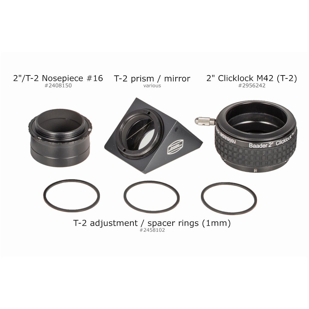 The Baader T-2 Maxbright 1.25" Mirror Diagonal is a precision-engineered optical component featuring proprietary Maxbright all-dielectric mirror coatings that deliver 99% reflectivity with minimal light scatter. Constructed from Sitall ceramic glass with a zero expansion coefficient, it maintains 1/10 wave flatness across the 35mm mirror surface, making it ideal for high-contrast planetary and lunar observation at high magnification. The modular T-2 system design allows complete configurability with Baader accessories for use in both 1.25" and 2" focusers, and integrates seamlessly with digital imaging applications and binoviewers. With durable coatings that resist scratching and a precision-machined aluminum housing supporting perfect 45-degree alignment, this diagonal delivers superior optical performance for serious amateur and professional astronomers.