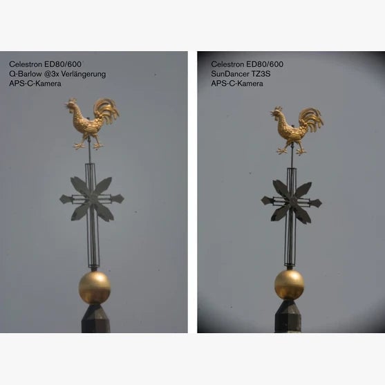 The Baader SunDancer II TZ-3S is an achromatic 3x telecentric system designed for H-alpha solar observation and planetary imaging that uses parallel light rays to maintain consistent magnification and image quality independent of working distance. Unlike standard Barlow lenses, this four-lens optical design with BBAR coating provides superior contrast and can serve as a high-quality magnification multiplier for both H-alpha filtered and broadband visual observation. Ideal for small-sensor planetary cameras, the system features dual 1.25"/2" nosepieces for telescope connection and a T-2 thread for camera attachment, achieving an f/30 focal ratio on f/10 telescopes.