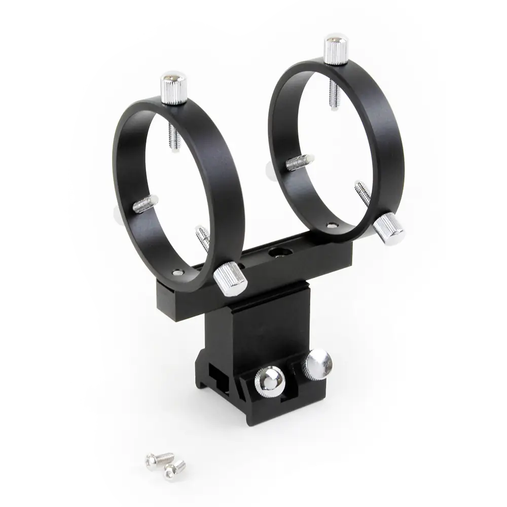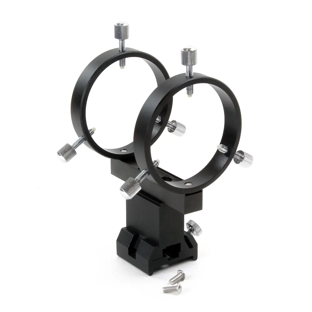 This user-friendly Vixen-style quick-release bracket for 50mm finderscopes eliminates the need to waste time mounting the bracket and finderscope to the telescope prior to every viewing session. Completely CNC machined, polished aluminum construction provides durability and precision for mounting finder or guide scopes. The three Teflon-tipped adjustment screws on both rings allow precise alignment of your finderscope, while the interior clearance of 55mm is enough to fit all 50mm plain finderscope models. Compatible with GT71 and WOSTAR 71 refractors, making it an ideal solution for astrophotographers seeking reliable finderscope attachment.