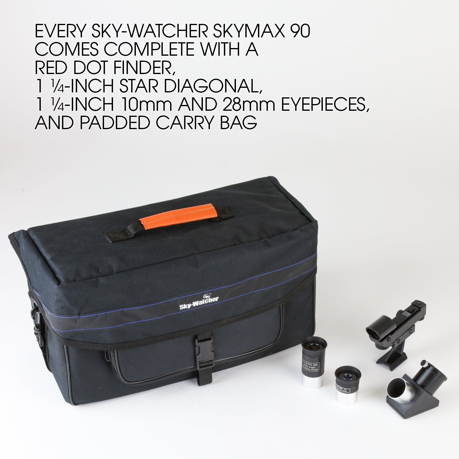 The Skymax 90's Maksutov-Cassegrain folded optical system provides sharp, high contrast images ideal for observing the Moon, planets, and deep-sky objects. Generally regarded as producing sharper images than Schmidt-Cassegrains, Maksutovs offer astronomers large visual aperture, high contrast and long focal length in a compact package, delivering higher levels of planetary detail due to a focal length that is 5-7 times longer than average Newtonian or refractor telescopes. The Skymax Maksutov-Cassegrains are the ultimate take-anywhere telescopes that, despite their small dimensions, pack a powerful punch with high-resolution, diffraction-limited optical systems that are multi-coated to maximize contrast and image sharpness.