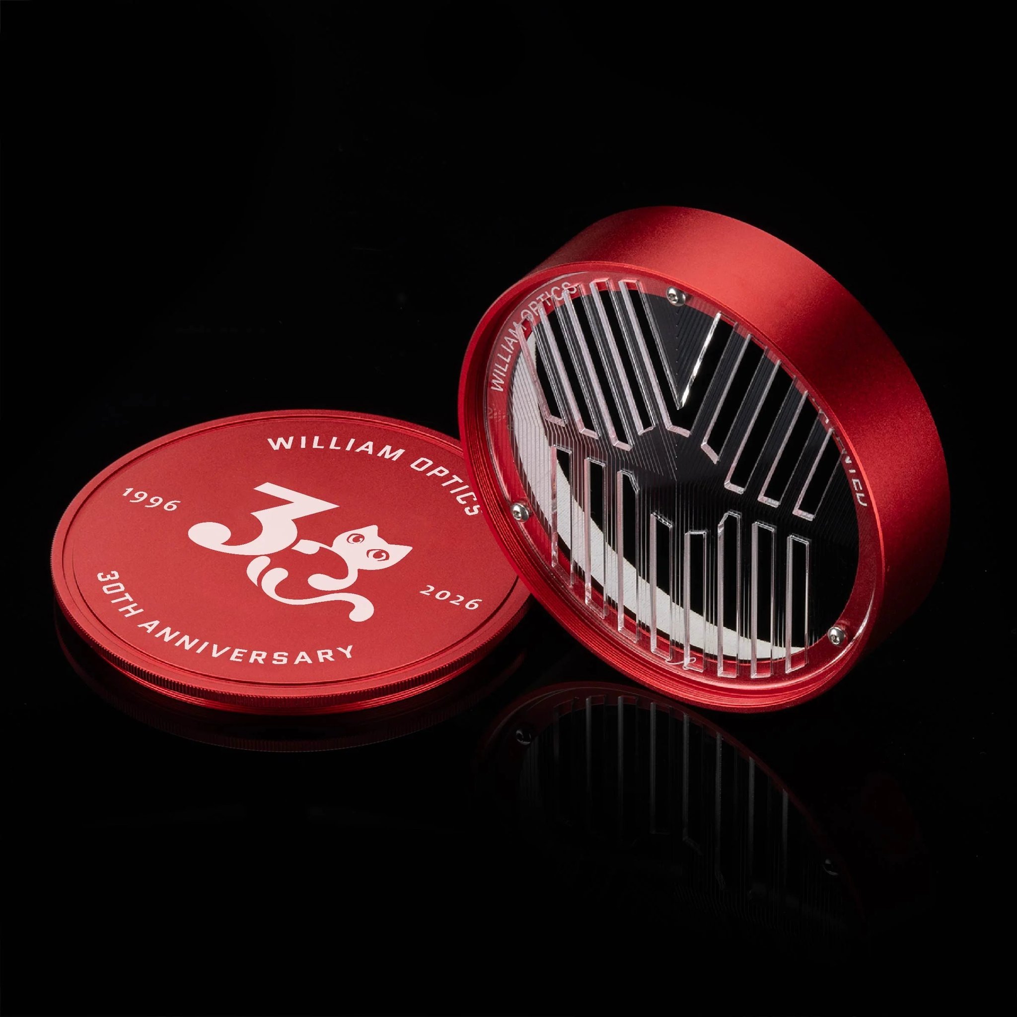 The Ultra-Cat 76 is a high-performance 76mm apochromatic refractor designed for astrophotographers who demand exceptional clarity and true color accuracy, featuring a 5-element advanced Petzval optical design with super ED and lanthanum glass and a fast f/4.8 focal ratio that delivers stunningly sharp, flat-field images across its 50mm image circle. Optimized for Full Frame, APS-C, and M4/3 sensors, it also offers compatibility with Medium Format cameras for outstanding wide-field astrophotography. The patented WIFD focusing design relocates the focuser to the center of the telescope, eliminating tube tilt caused by the weight of cameras and accessories, and by removing the need for a traditional rear drawtube, the optical path remains fully unobstructed. This limited edition of 100 units worldwide combines uncompromising astrophotography performance with a symbolic anniversary finish, featuring a unique laser-engraved emblem of a cat embracing "30" and personally hand-signed by founder William Yang on the lens cover.