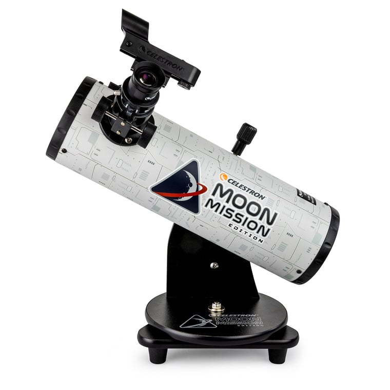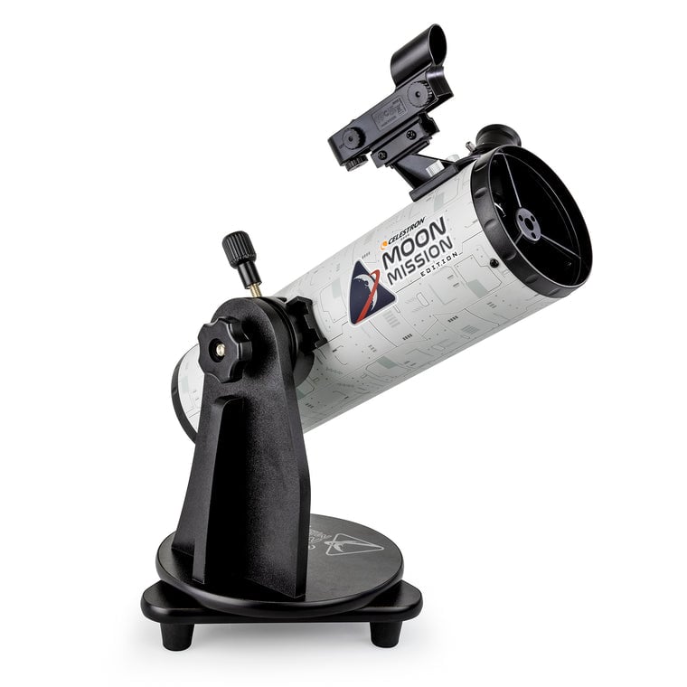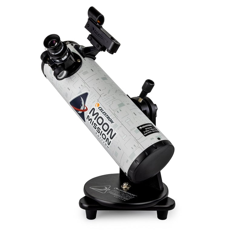 The Celestron Moon Mission 100mm is a compact tabletop Dobsonian reflector telescope designed for accessible astronomy and lunar observation. Featuring a high-quality 100mm parabolic mirror with an f/4 focal ratio, this telescope delivers sharp, bright views of the Moon's surface details, planets, and deep-sky objects including nebulae and star clusters. The complete kit includes two eyepieces (20mm and 8mm), a red-dot finderscope, an included Moon filter for comfortable lunar viewing, a detailed Moon map, and Starry Night astronomy software, making it an ideal choice for families and beginners seeking an easy-to-use entry-level telescope.