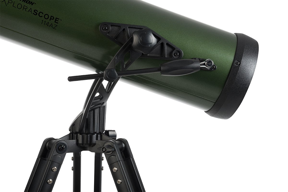 The Celestron ExploraScope 114AZ is a portable 114mm Newtonian reflector telescope designed for beginner astronomers seeking capable performance without complexity. With its fully multicoated glass optics and manual alt-azimuth mount, this telescope excels at observing the Moon, planets, and brighter deep-sky objects like the Orion Nebula and star clusters. The complete package includes two eyepieces, a 3x Barlow lens, red-dot finderscope, and an adjustable aluminum tripod, weighing just 6.7 pounds total for easy transport and quick setup.