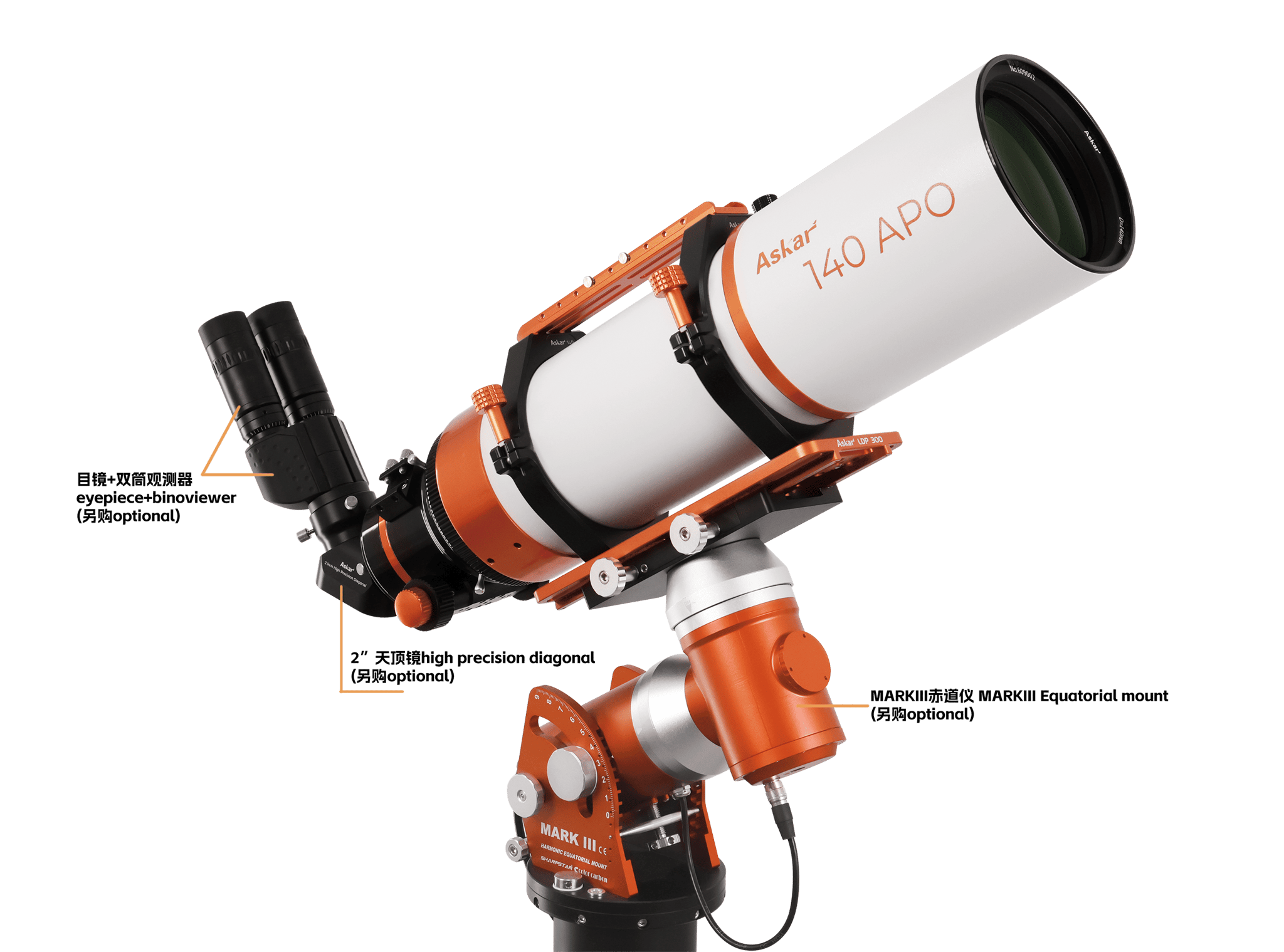 The Askar 140APO is an OTA with a 140mm aperture, 980mm focal length, and f/7 native focal ratio. It adopts a triplet air-spaced APO lens design including one piece of ED glass, employing special optical designs and multiple lens elements to correct chromatic aberration providing higher-quality object details and color accuracy. Designed with portability in mind as a large aperture, long focal ratio telescope, the shortest overall length is only 735mm with a net weight of 9.2kg. The telescope is equipped with a large rigid 3.5" dual-speed rack and pinion focuser which is compatible with most motorized focusers on the market.