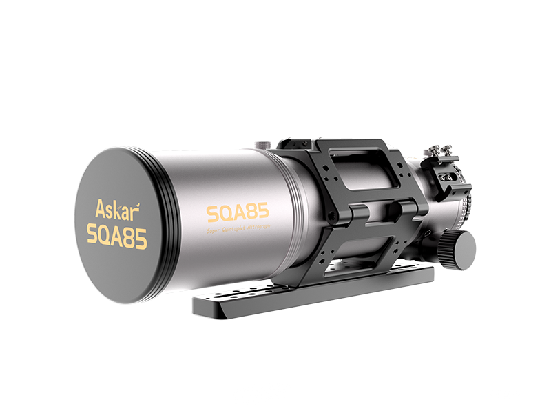 The Askar SQA85 is a high quality quintuplet air-spaced SD glass Petzval astrograph designed to deliver stunning astrophotos. Five internal lens elements work together to eradicate coma, field curvature, and any other aberrations that may be present, with an inherent flat field that means stars are sharp all the way to the corners, even with full frame cameras. With an 85mm aperture, 408mm focal length, and f/4.8 focal ratio, the telescope delivers exceptional color correction while supporting a 44mm full-frame image circle without requiring additional flatteners. The optical tube assembly weighs approximately 3.64 kilograms, making it manageable for transport to different observation sites while its compact size doesn't compromise performance.