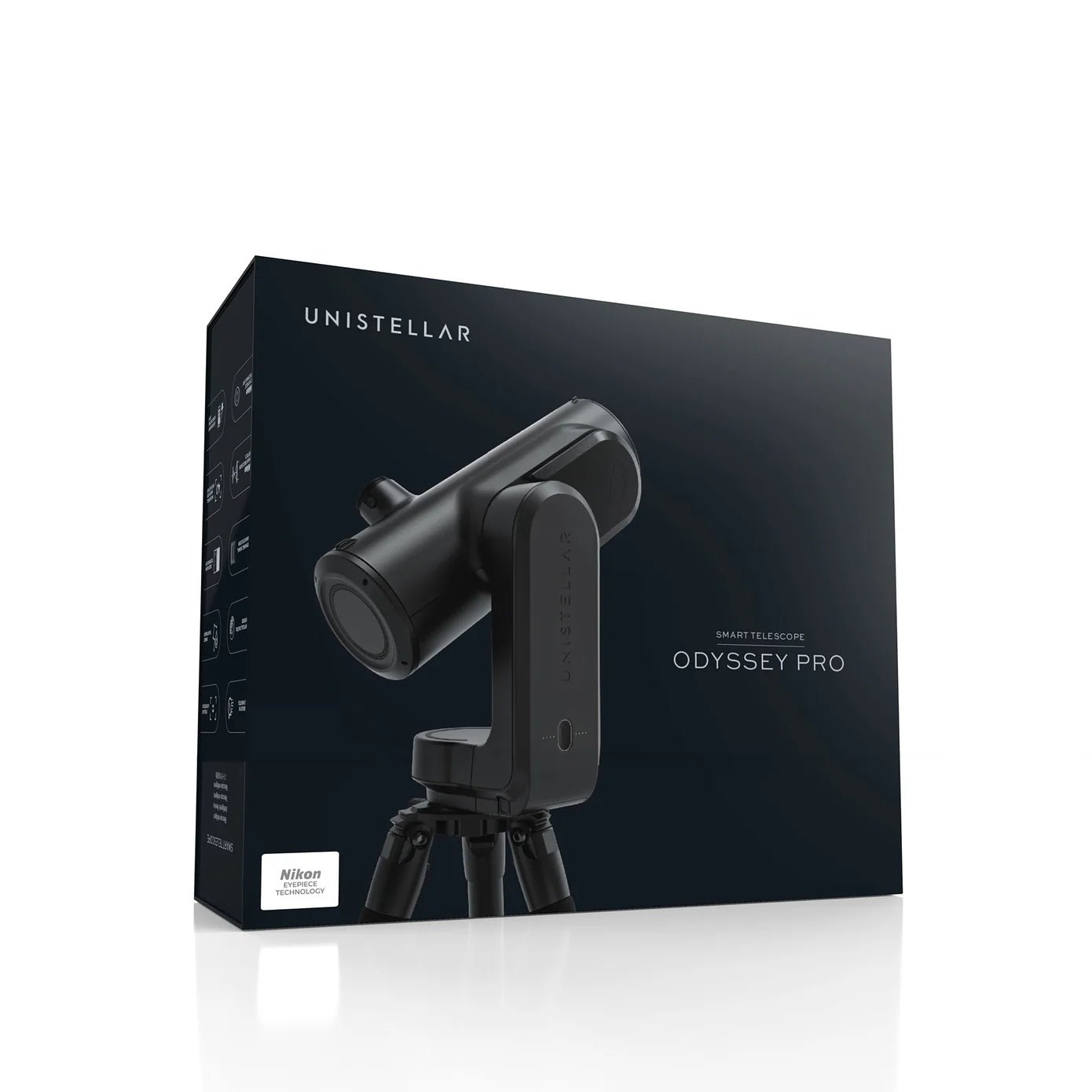 The UniStellar Odyssey Pro is a fully automated smart telescope that brings deep-sky astrophotography within reach of beginners and experienced observers alike. Featuring an 85mm aperture reflector with advanced image processing, an electronic Nikon eyepiece for immersive viewing, and integrated motorized alt-azimuth GoTo tracking, this compact system requires no collimation or polar alignment—simply set it up and observe via the intuitive mobile app. With capabilities for capturing nebulae, galaxies, planets, and star clusters from light-polluted urban locations, the Odyssey Pro combines premium optics, proprietary Deep Dark Technology for light pollution reduction, and RAW/FITS export for advanced astrophotography workflows.